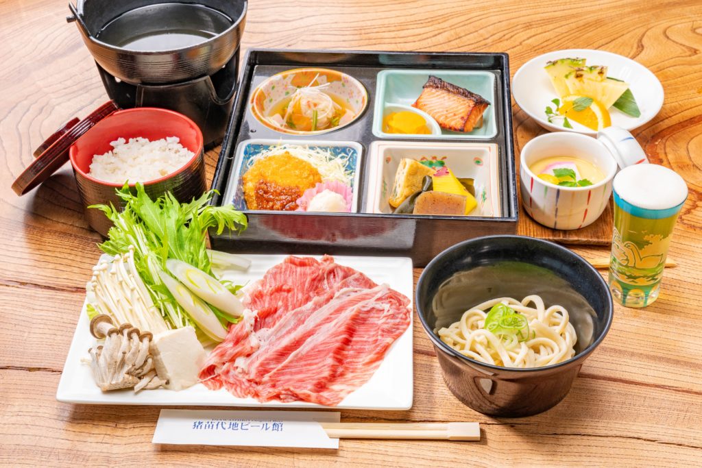 しんじょうの野菜あんかけ/季節の魚の塩糀焼・車麩煮付・香の物/炊き合わせ/ヒレカツ・ポテトサラダ/国産牛のしゃぶしゃぶ/茶碗蒸し/ぶっかけ自家製豆乳うどん/ご飯/水菓子