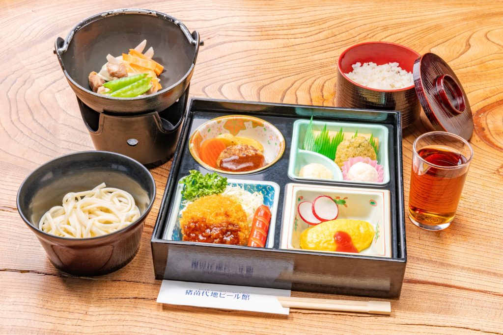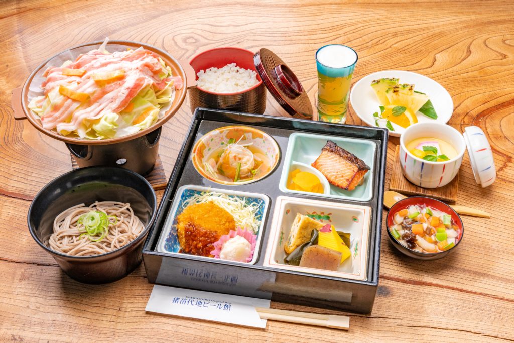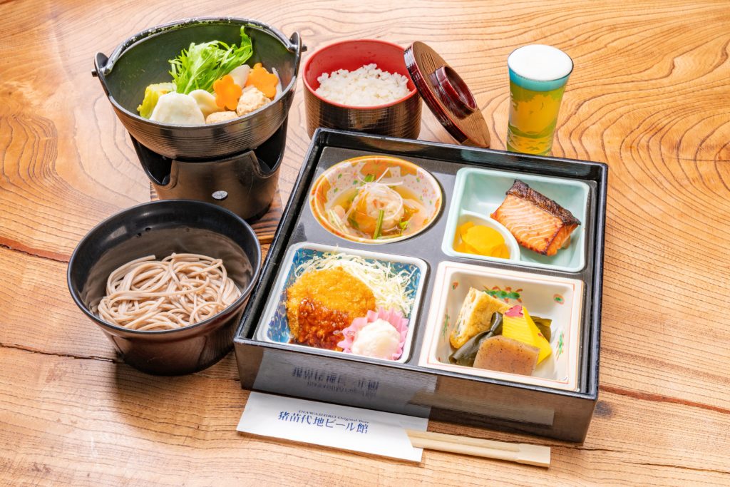 しんじょうの野菜あんかけ/季節の魚の塩糀焼・車麩煮付・香の物/炊き合わせ/ヒレカツ・ポテトサラダ/国産豚と野菜の陶板焼/茶碗蒸し/こづゆ/ぶっかけそば/ご飯/水菓子